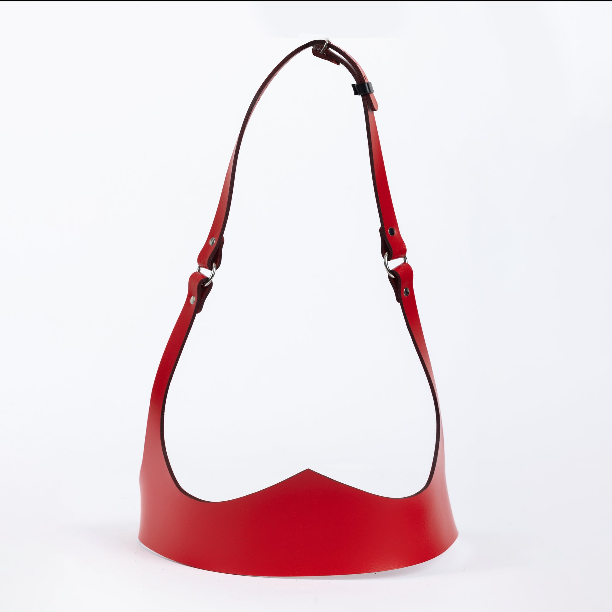 Elegant genuine leather harness with adjustable back strap. Available in red and black. Perfect for fashion or fetish styling.