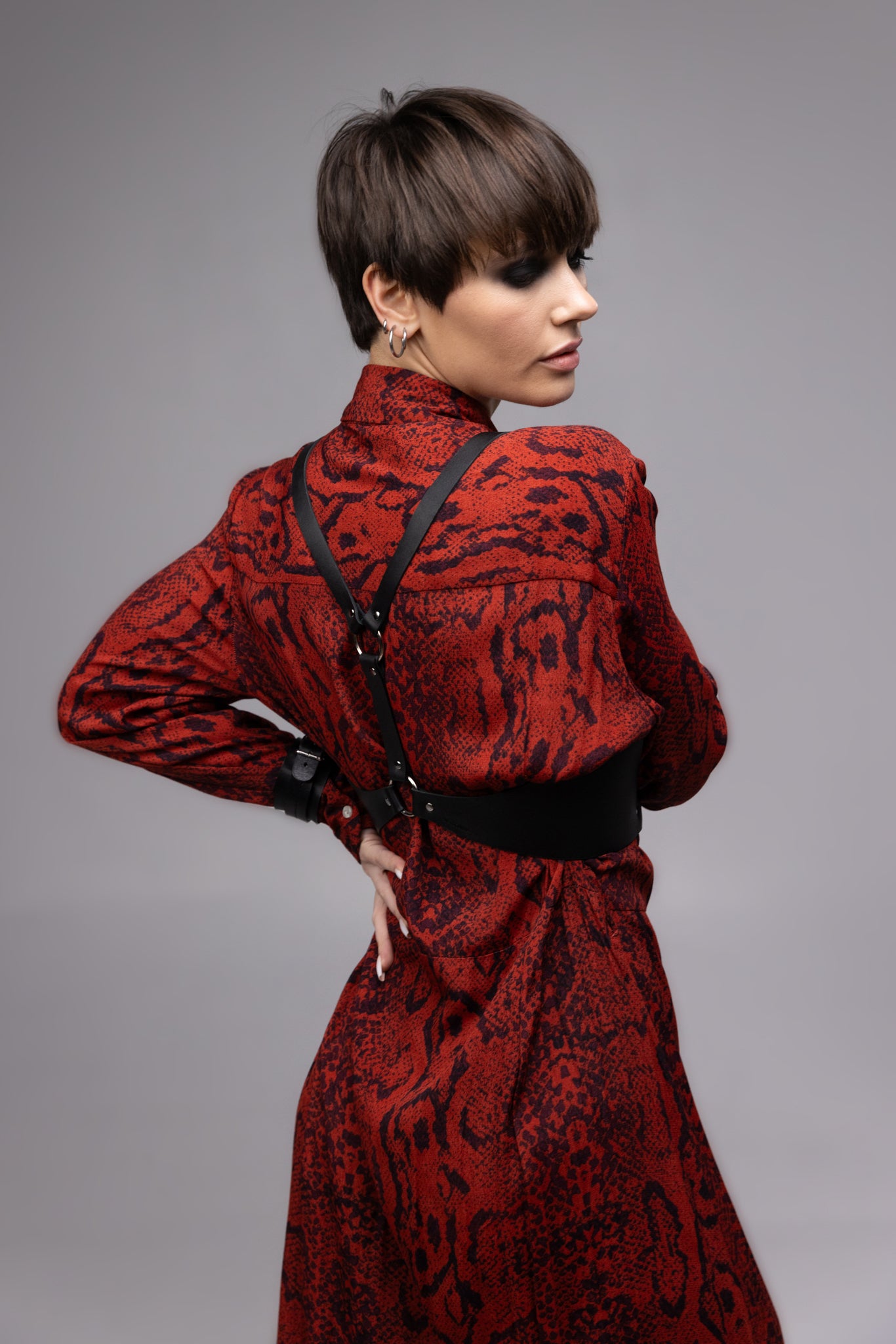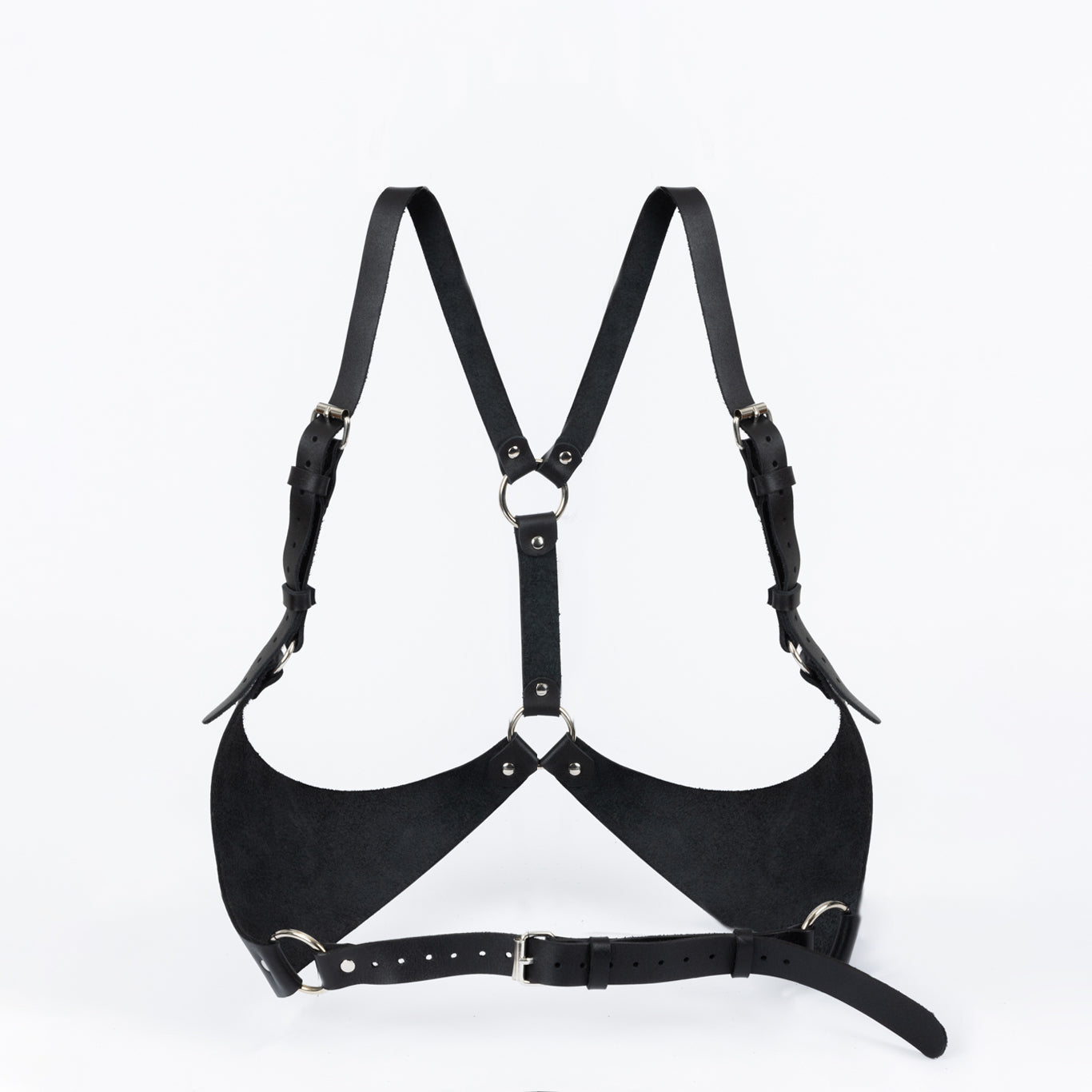 Designed to be worn over clothing or directly on the skin, this harness is both a statement fashion accessory and a symbol of controlled elegance. Whether styled for editorial looks, performance wear, or intimate moments, it captures attention from every angle.